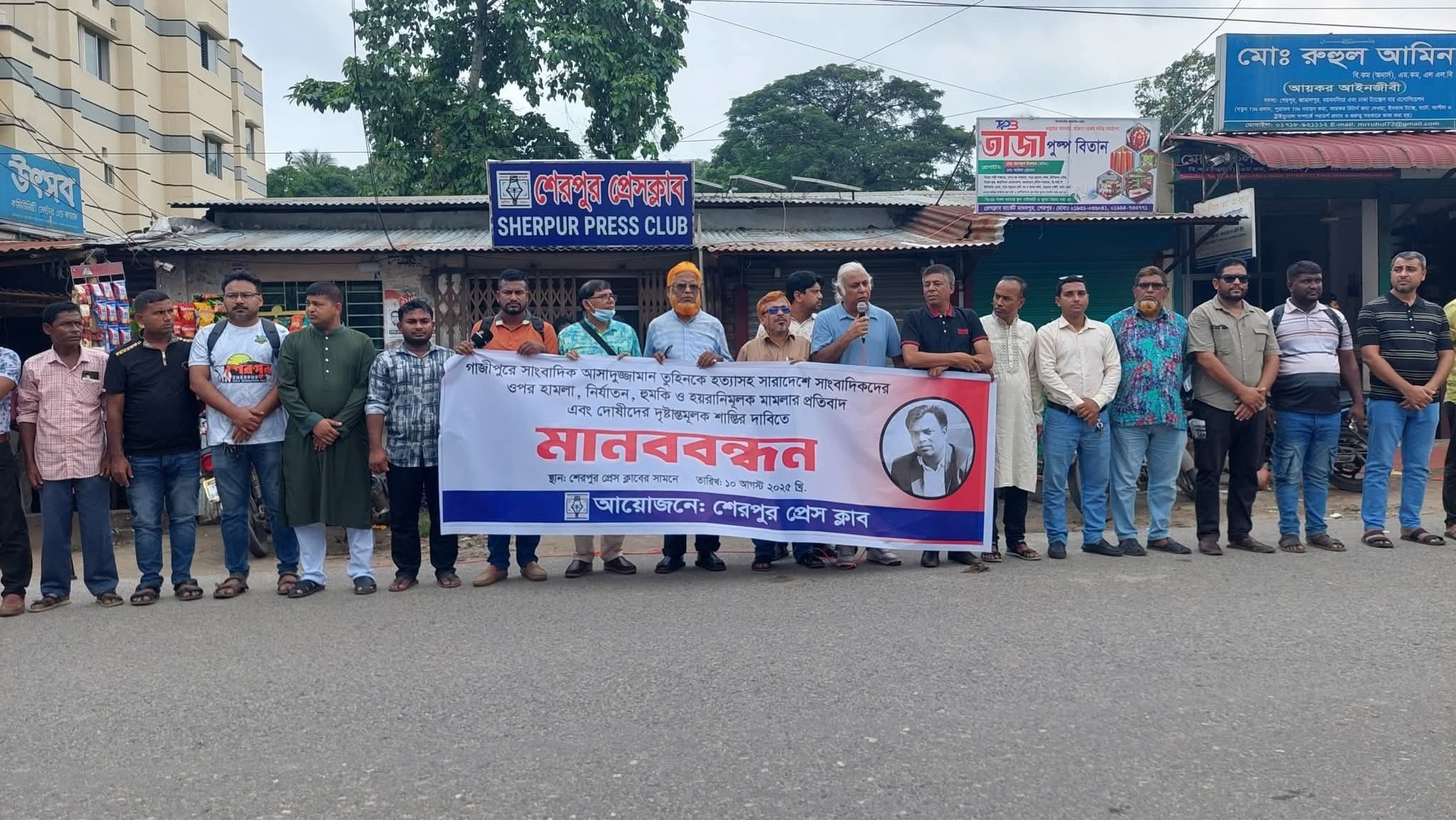 গাজীপুরের সাংবাদিক আসাদুজ্জামান তুহিন হত্যা, সারাদেশে সাংবাদিকদের ওপর হামলা, নির্যাতন, হুমকি ও হয়রানিমূলক মামলার প্রতিবাদে শেরপুর প্রেসক্লাব ঘন্টাব্যাপী মানববন্ধন করেছে।