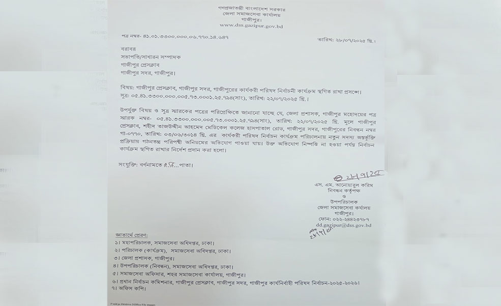 নতুন সদস্য অন্তর্ভূক্তি প্রক্রিয়ায় গঠনতন্ত্র লংঘনের অভিযোগে গাজীপুর প্রেসক্লাব (রেজি নং গা-০৭৭০) এর কার্যকরী পরিষদ নির্বাচনের কার্যক্রম স্থগিত রাখার জন্য