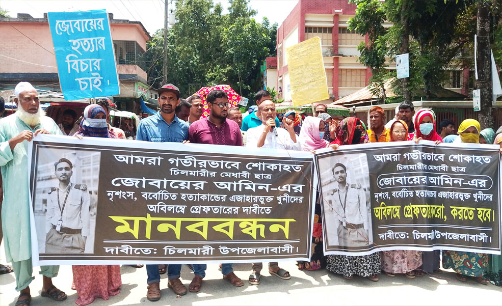 জুলাই আন্দোলনের সংগঠক জোবায়ের আমিন হত্যাকারীদের গ্রেফতার ও দৃষ্টান্তমূলক শাস্তির দাবিতে কুড়িগ্রামে চিলমারীতে সড়ক অবরোধ করে বিক্ষোভ সমাবেশ করেছে নিহতের