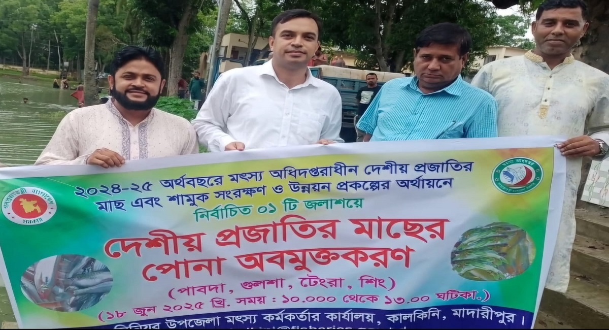 মাদারীপুরের কালকিনিতে মুক্ত জলাশয়ে দেশীয় মাছের পোনা অবমুক্ত করা হয়।মৎস্য অধিদপ্তরের দেশীয় প্রজাতির মাছ এবং শামুক সংরক্ষণ ও উন্নয়ন প্রকল্পের