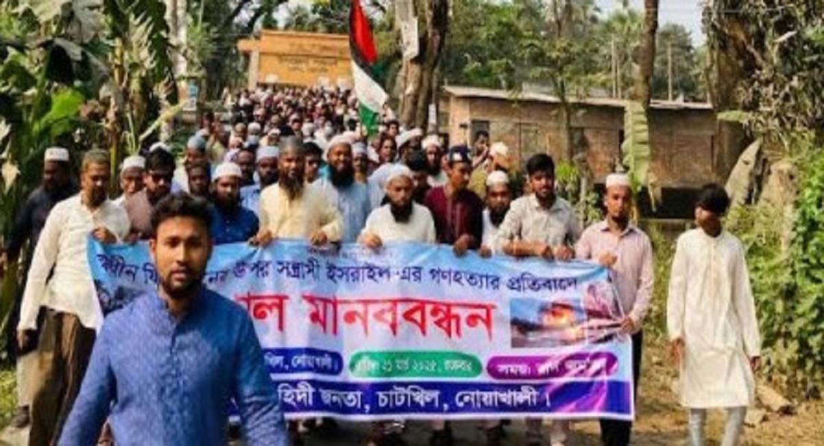 নোয়াখালীর চাটখিলে ফিলিস্তিনের নিরীহ মুসলমানদের উপর ইসরাইলের আগ্রাসন ও গণহত্যার প্রতিবাদে তৌহিদী জনতার উদ্যোগে মানববন্ধন ও বিক্ষোভ মিছিল অনুষ্ঠিত হয়েছে।