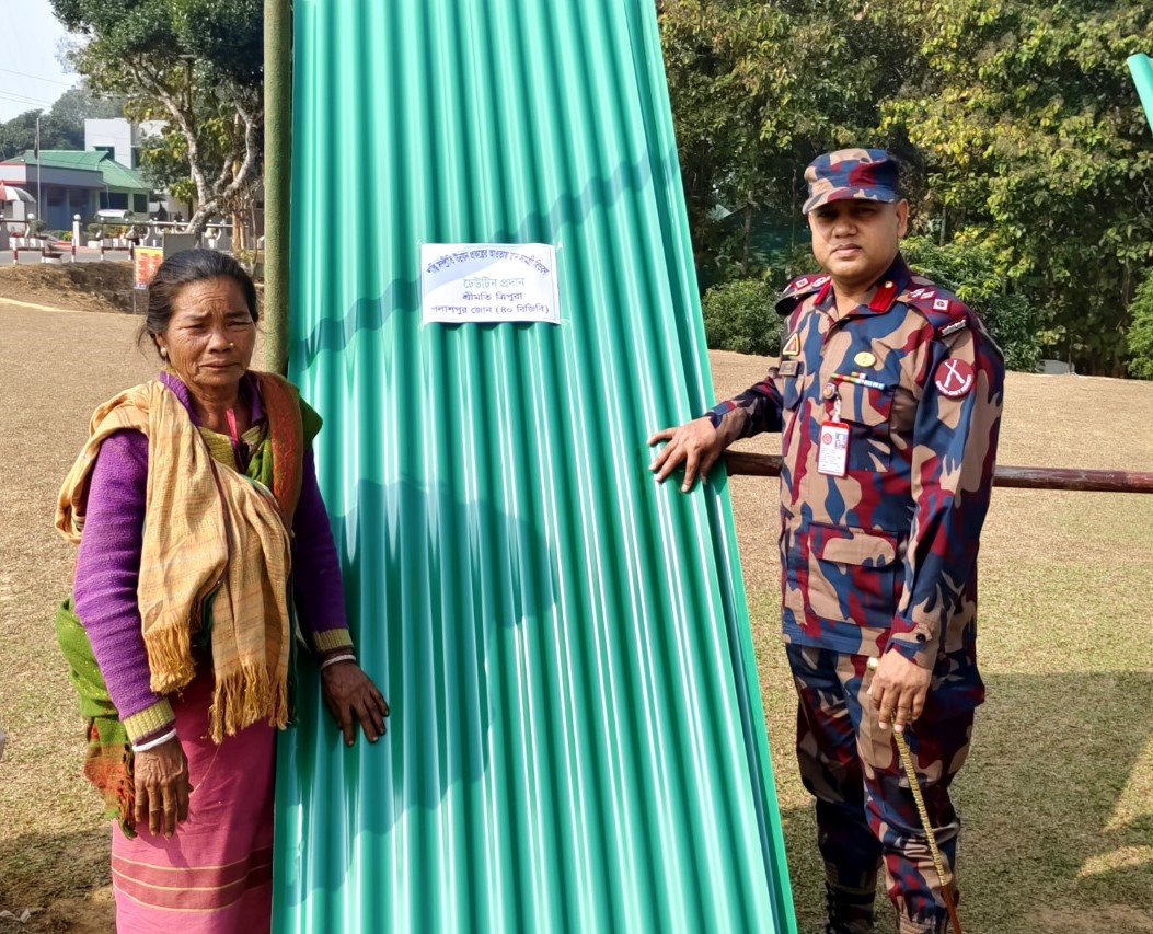 সম্প্রীতি ও উন্নয়ন প্রকল্পের আওতায় পলাশপুর জোন (৪০ বিজিবি) কর্তৃক স্থানীয় পাহাড়ী বাঙ্গালী ও দুঃস্থ অসহায় মাঝে ঢেউটিন, সেলাই মেশিন,