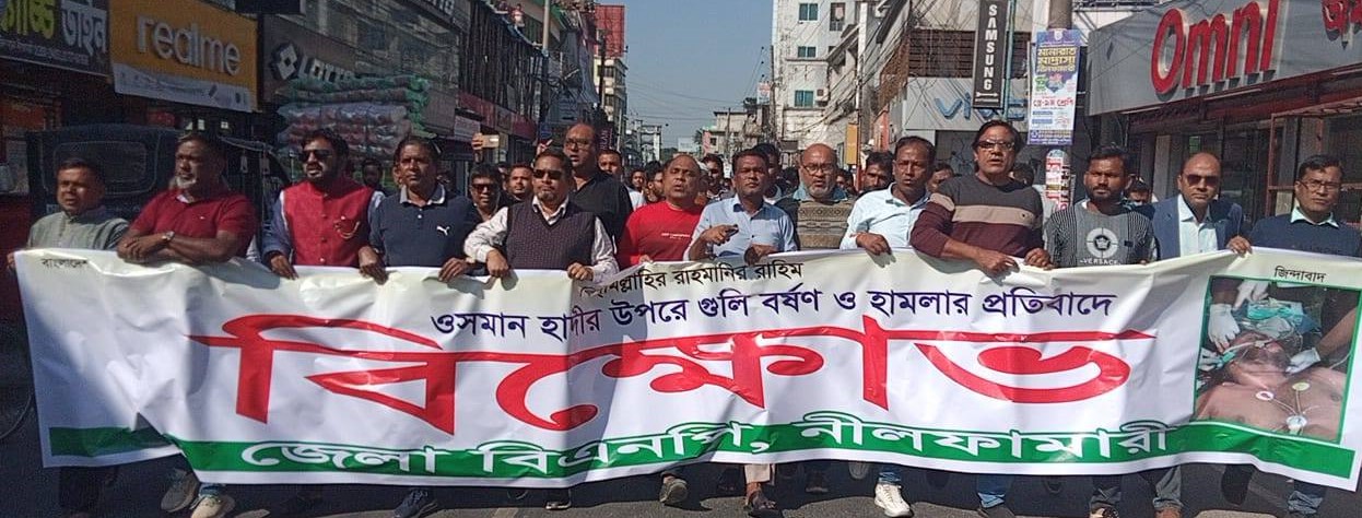 ঢাকা-৮ আসনে স্বতন্ত্র প্রার্থী ইনকিলাব মঞ্চের নেতা শরীফ ওসমান হাদীকে হত্যা চেষ্টার প্রতিবাদে নীলফামারীতে বিক্ষোভ মিছিল ও সমাবেশ করেছে জেলা