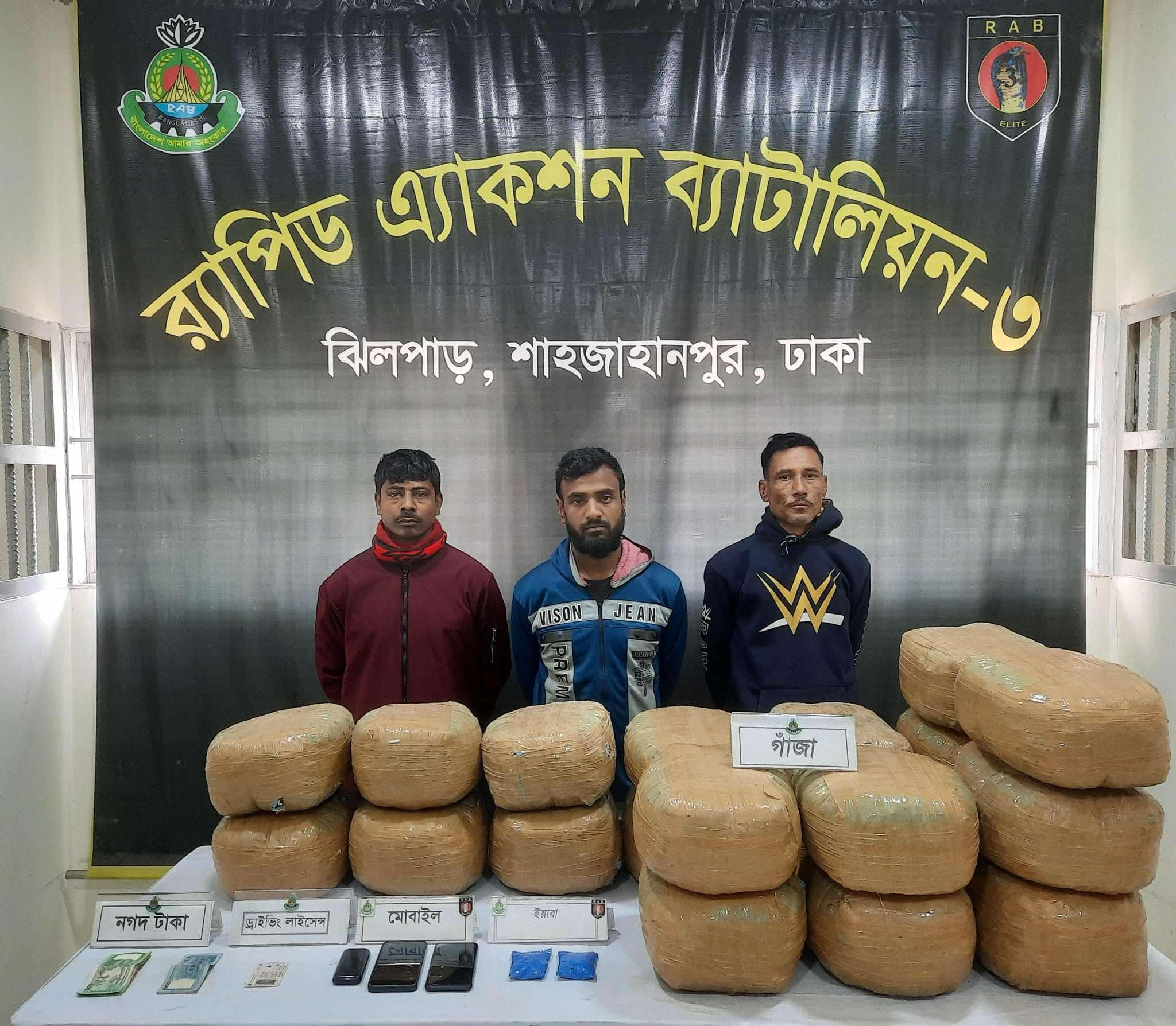 বিপুল পরিমাণ গাঁজা ও ৯৮৫ পিছ ইয়াবা ৩ মাদক কারবারি’কে গ্রেফতার করেছে র্যাব-৩
