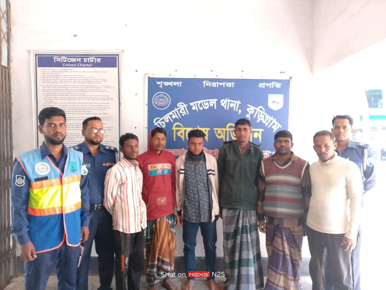 কুড়িগ্রামের চিলমারী উপজেলার ব্রহ্মপুত্র নদের বড়ভিটার চর এলাকায় ইলেকট্রিক শক মেশিন দিয়ে মাছ ধরার সময় দুটি ইলেকট্রিক মেশিনসহ ৬জন