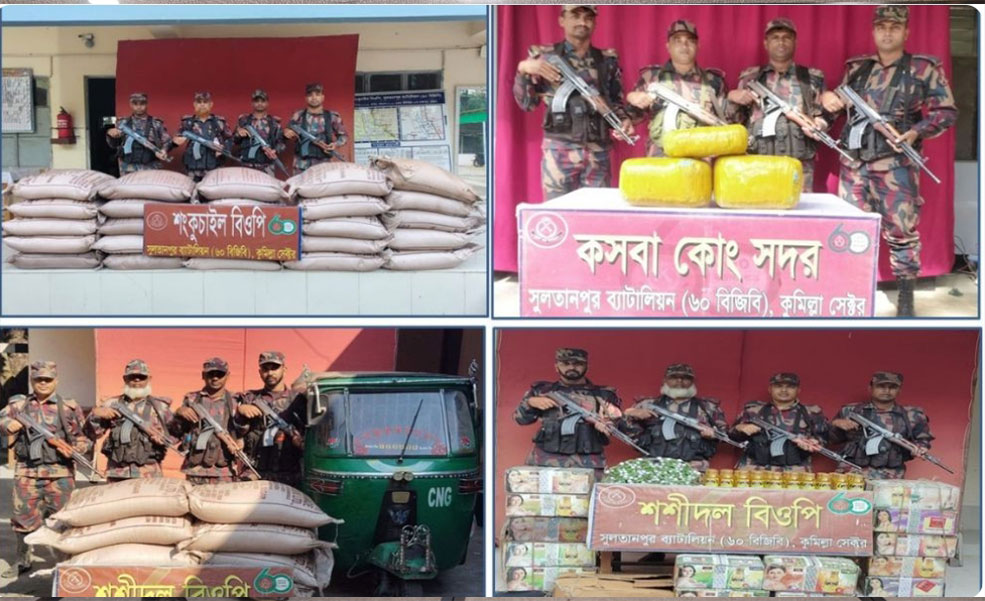 ব্রাহ্মণবাড়িয়ায় সুলতানপুরে বর্ডার গার্ড বাংলাদেশের (বিজিবি) ৬০ ব্যাটালিয়নের অভিযানে গত তিন দিনে প্রায় এক কোটি টাকার ভারতীয় পণ্য জব্দ করা