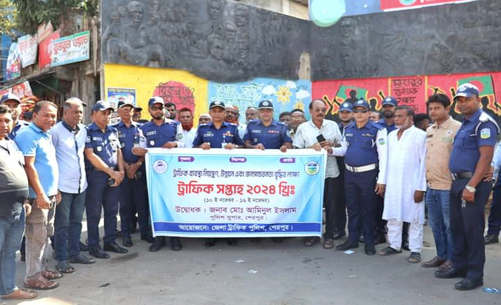 ট্রাফিক ব্যবস্থা নিয়ন্ত্রণ, উন্নয়ন ও জনসচেতনতা বৃদ্ধির লক্ষ্যে শেরপুর জেলা পুলিশের ট্রাফিক বিভাগের উদ্যোগে ০৭ দিনব্যাপী ট্রাফিক সপ্তাহ- ২০২৪ উদ্বোধন
