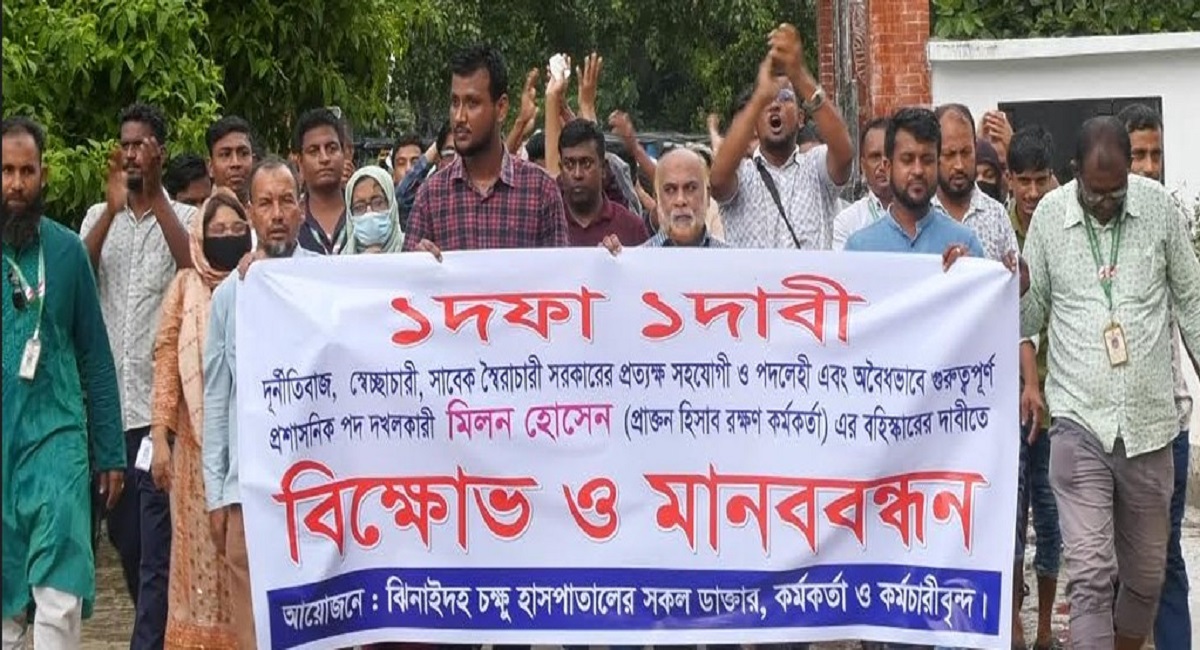 ঝিনাইদহ চক্ষু হাসপাতালের সহকারী পরিচালক মিলন হোসেন বহিস্কারের দাবীতে বিক্ষোভ মিছিল ও মানববন্ধন কর্মসূচী পালন করেছে হাসপাতালের চিকিৎসক-কর্মকর্তা ও কর্মচারীরা।