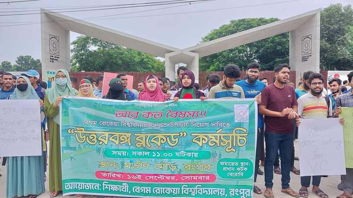 রংপুরে বেগম রোকেয়া বিশ্ববিদ্যালয়ে (বেরোবি) উপাচার্য নিয়োগের দাবিতে ‘উত্তরবঙ্গ ব্লকেড’ কর্মসূচি পালন করছেন বিশ্ববিদ্যালয়ের শিক্ষার্থীরা।এ সময় রংপুর বেগম রোকেয়া বিশ্ববিদ্যালয়ে