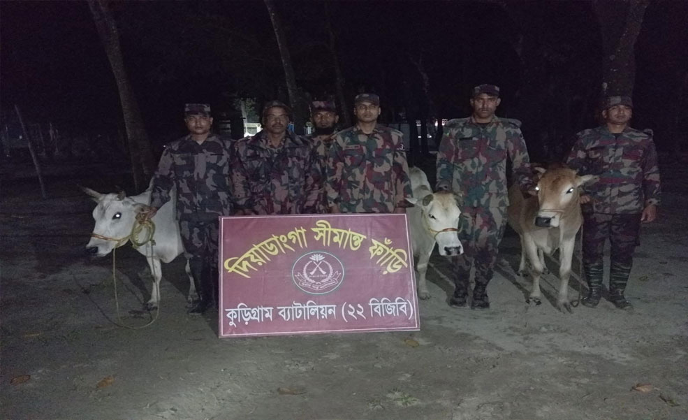 কুড়িগ্রামের ভুরুঙ্গামারী ও নাগেশ্বরী সীমান্তে বর্ডার গার্ড বাংলাদেশ (বিজিবি) এর বিশেষ অভিযানে ভারতীয় ৪টি গরু ও ৭০ বোতল বিদেশি মদ