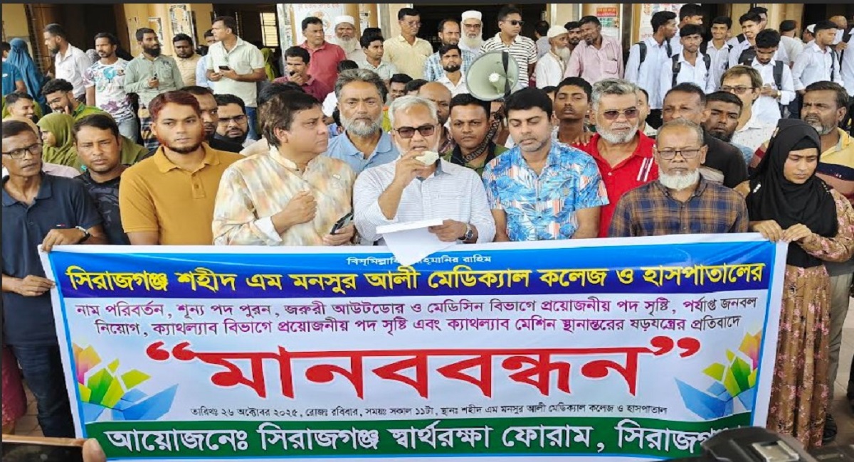 সিরাজগঞ্জের শহীদ এম মনসুর আলী মেডিকেল কলেজ হাসপাতাল থেকে কাডিয়া ক্যাথ-ল্যাব মেশিন অন্যত্র সরিয়ে নেওয়ার ষড়যন্ত্রের প্রতিবাদ, শুন্য পদ পুরন,