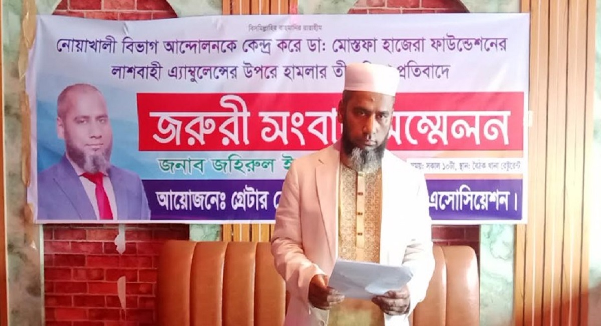 কুমিল্লায় নোয়াখালীর লাশবাহী ডাঃ মোস্তফা হাজেরা ফাউন্ডেশনের ফ্রি সেবার অ্যাম্বুলেন্সে হামলার প্রতিবাদে সংবাদ সম্মেলন অনুষ্ঠিত হয়। রবিবার (২৬ অক্টোবর) নোয়াখালীর