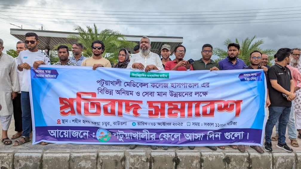 পটুয়াখালী সদর হাসপাতালে অনিয়মের বিরুদ্ধে মানববন্ধন ও প্রতিবাদ সমাবেশ অনুষ্ঠিত