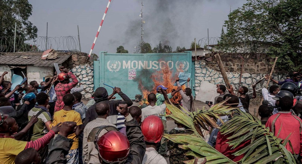 বিক্ষোভের সময় কঙ্গোর গোমায় জাতিসংঘ শান্তিরক্ষা মিশন মনুস্কোর সদর দপ্তরের সামনে আগুন ধরিয়ে দেয় বিক্ষোভকারীরা। ছবিটি ২০২২ সালের ২৫ জুলাই