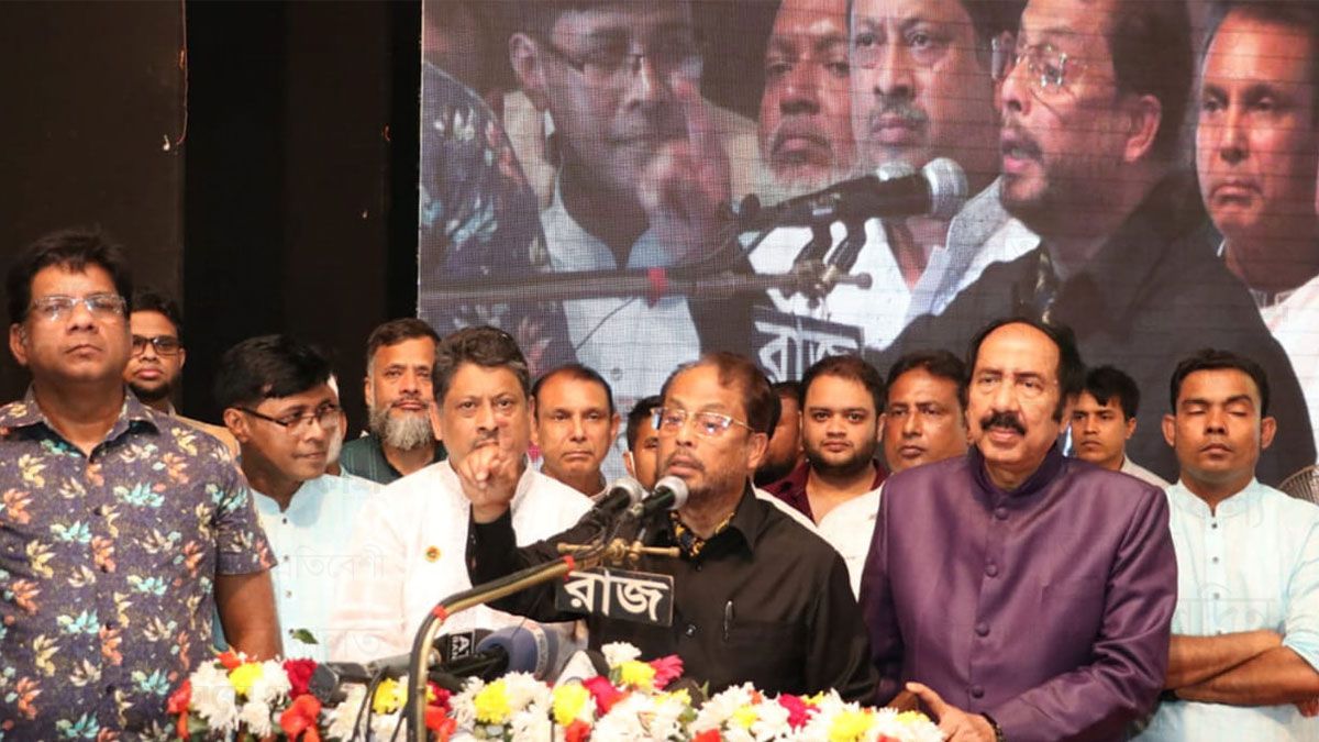 শনিবার রাজধানীর মহানগর নাট্যমঞ্চে জাতীয় পার্টি ঢাকা মহানগর দক্ষিণের দ্বি-বার্ষিক সম্মেলনে বক্তব্য রাখছেন দলটির চেয়ারম্যান জি এম কাদের এমপি। জাতীয়