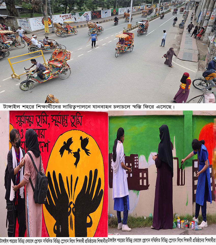 টাঙ্গাইলে শিক্ষার্থীদের স্পর্শে বদলে গেলো শহর, সড়কেও স্বস্তি