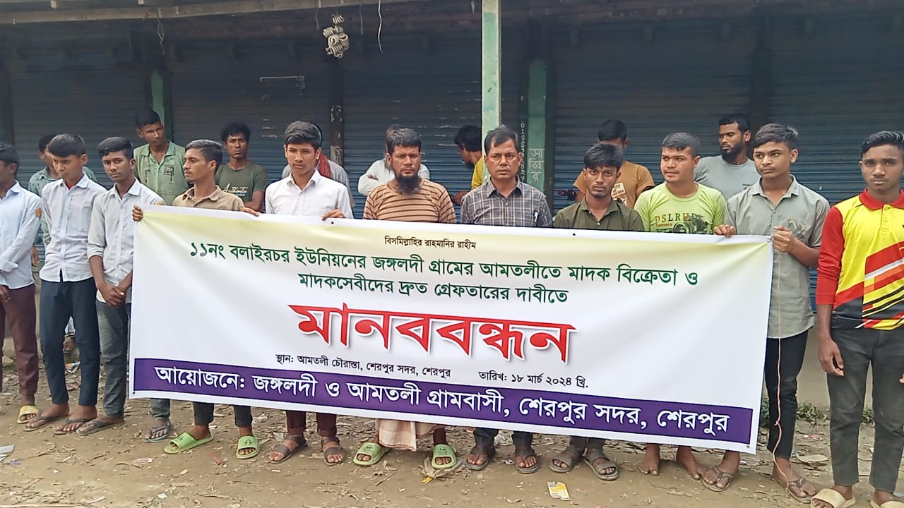 শেরপুরে মাদক বিক্রেতা-সেবীদের দ্রুত গ্রেফতারের দাবিতে এলাকাবাসীর মানববন্ধন