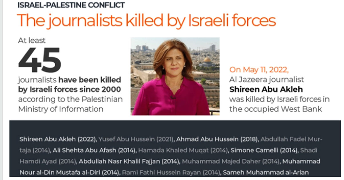 ফিলিস্তিনের তথ্য মন্ত্রণালয় জানিয়েছে, ২০০০ সাল থেকে এ পর্যন্ত ইসরায়েলি বাহিনীর হাতে কমপক্ষে ৪৫ জন সাংবাদিক নিহত হয়েছেন। সবশেষ আল