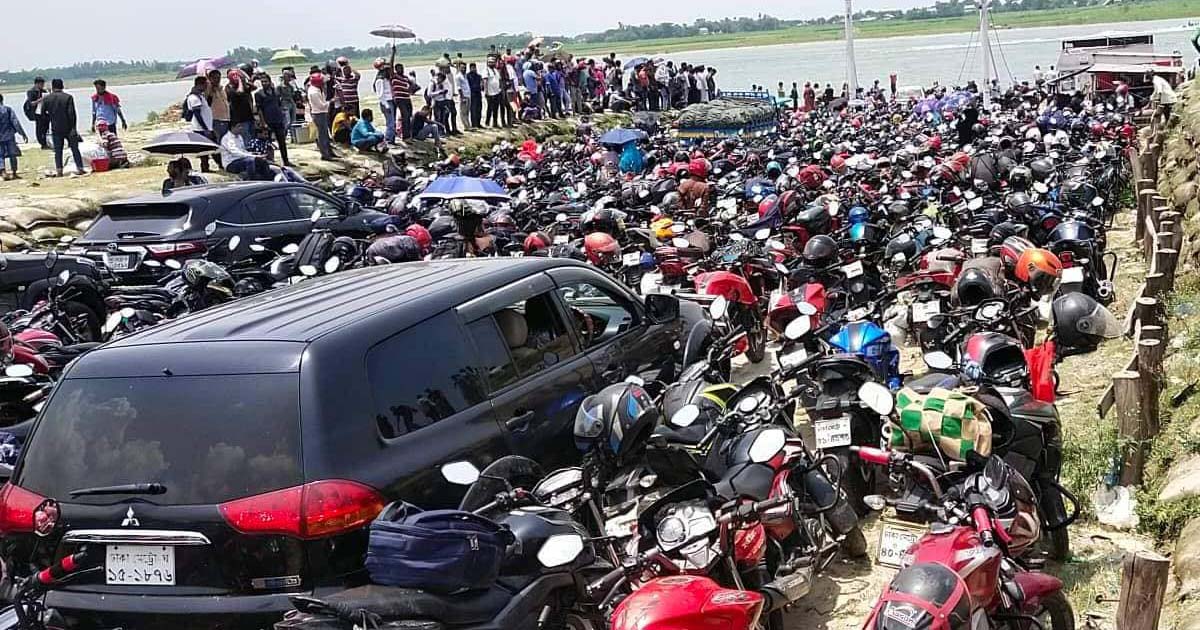 মাদারীপুরের বাংলাবাজার ঘাটে রাজধানীমুখী যাত্রীদের উপচে পড়া ভিড়
