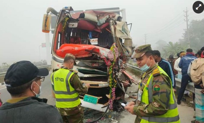 কাভার্ডভ্যানে বাসের ধাক্কায় নিহত ১, আহত ১০