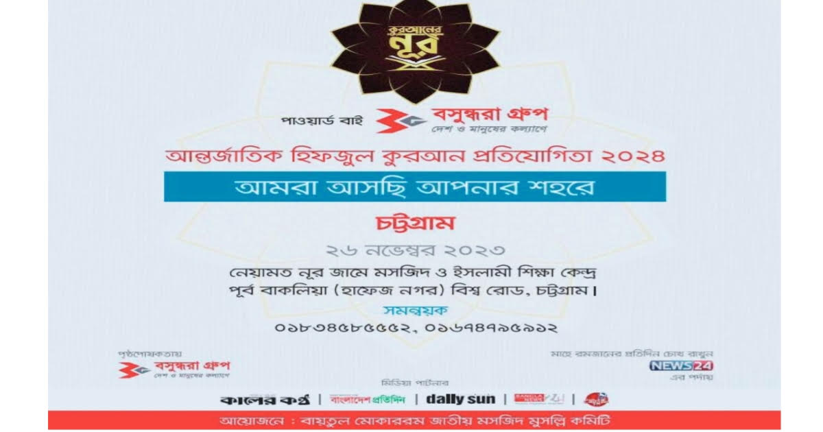 আন্তর্জাতিক হিফজুল কুরআন বিষয়ক মেগা রিয়েলিটি শো ‘কুরআনের নূর পাওয়ার্ড বাই বসুন্ধরা গ্রুপ’-২০২৪ প্রতিযোগিতার চট্টগ্রাম বিভাগের অডিশন রাউন্ড আগামী নভেম্বর