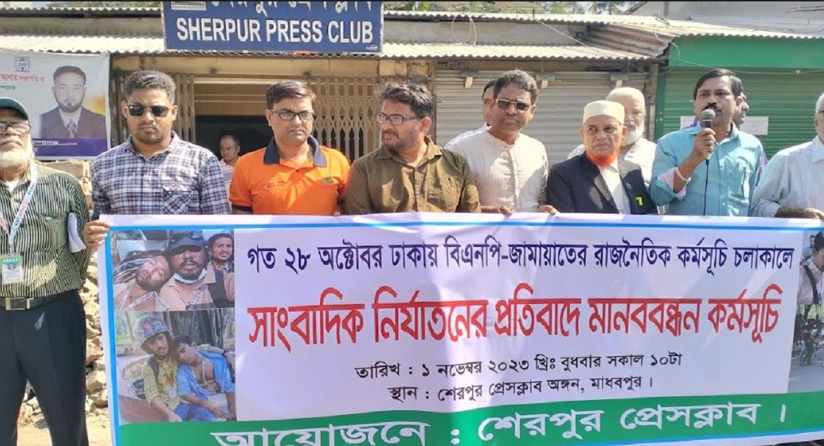 সাংবাদিক হত্যা ও নির্যাতনের প্রতিবাদে শেরপুরে মানববন্ধন অনুষ্ঠিত