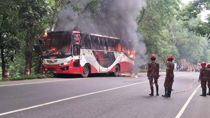 বাস-ইজিবাইক মুখোমুখি সংঘর্ষে নিহত ২, বিক্ষুব্ধ জনতার বাসে আগুন