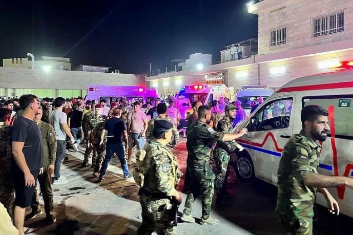 হামদানিয়া জেনারেল হাসপাতালের বাইরে ইরাকের সৈন্য ও জরুরি পরিষেবার কর্মীদের দেখা যাচ্ছে ইরাকে বিয়ের অনুষ্ঠানে ভয়াবহ অগ্নিকাণ্ডে শতাধিক মানুষ নিহত