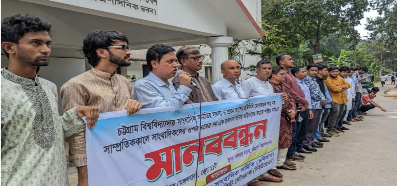 প্রথম আলোর চবি ক্যাম্পাস প্রতিনিধি মোশাররফ শাহের উপর ছাত্রলীগের হামলা ও নির্যাতনের প্রতিবাদে মানববন্ধন করেছে চট্টগ্রাম বিশ্ববিদ্যালয় সাংবাদিক সমিতি (চবিসাস)