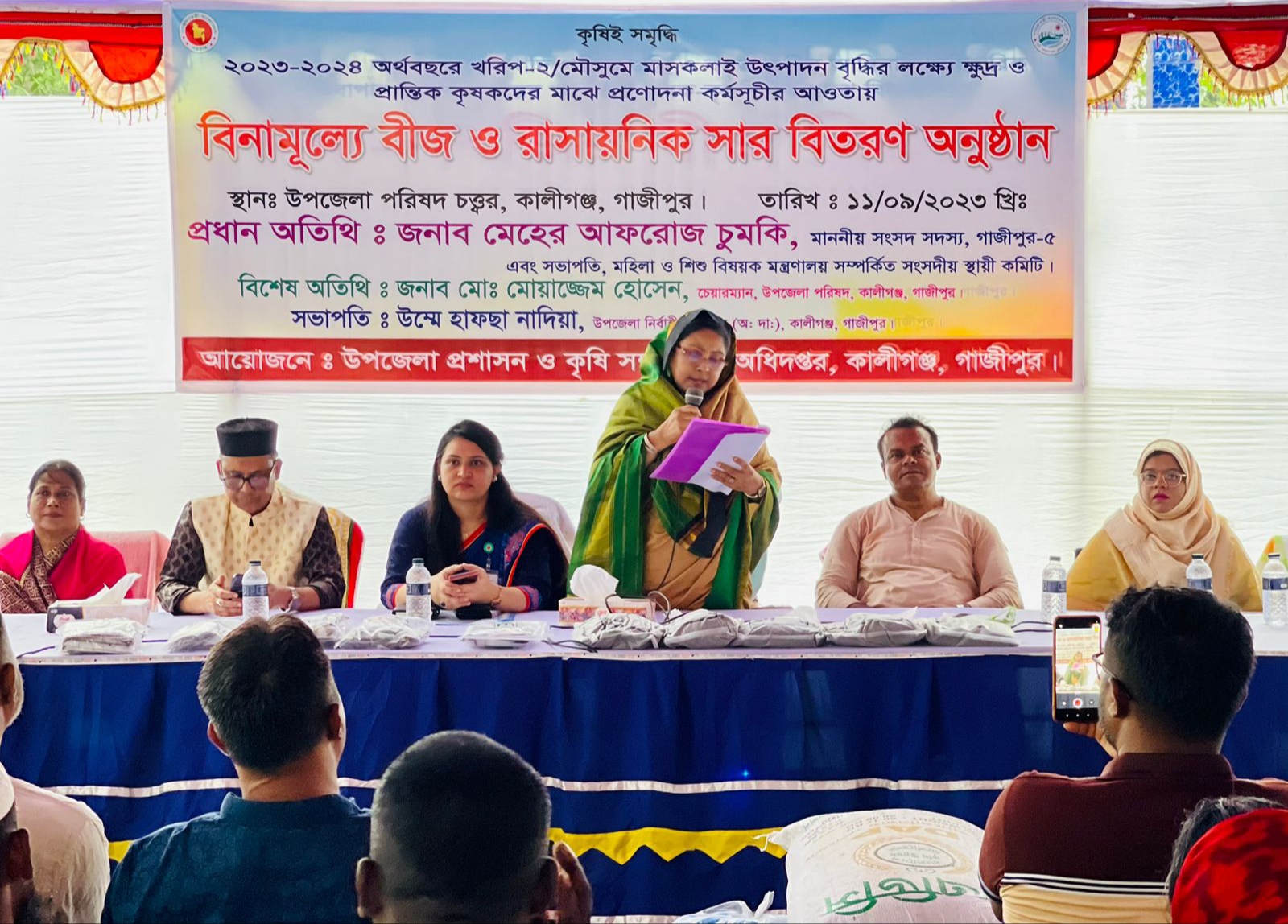 গাজীপুরের কালীগঞ্জে স্থানীয় ২৩০ জন ক্ষুদ্র ও প্রান্তিক কৃষকের মাঝে বিনামূল্যে রাসায়নিক সার ও বীজ বিতরণ করা হয়েছে। সোমবার (১১