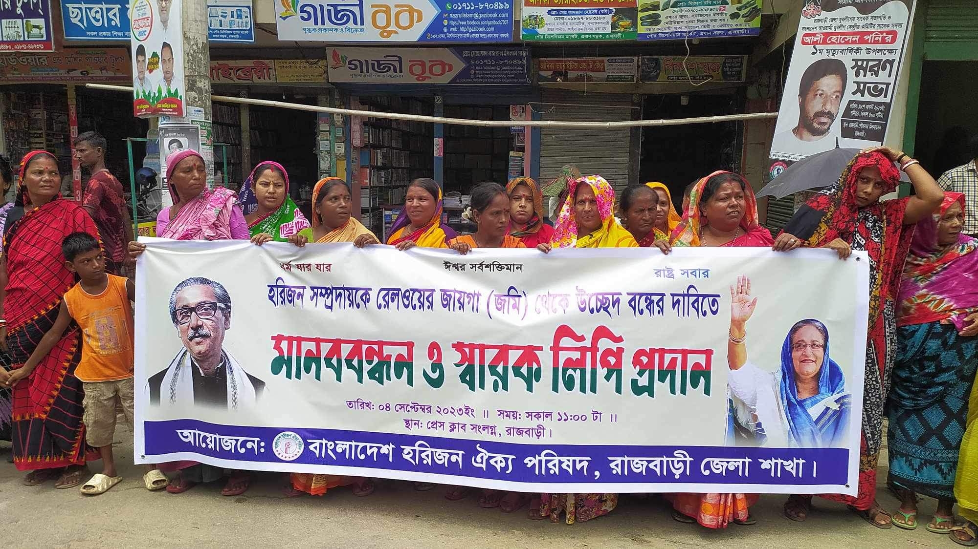 রাজবাড়ীতে হরিজন সম্প্রদায়কে রেলওয়ের জমি থেকে উচ্ছেদ বন্ধের দাবিতে মানববন্ধন ও স্মারকলিপি প্রদান করেছে বাংলাদেশ হরিজন ঐক্য পরিষদ রাজবাড়ী জেলা