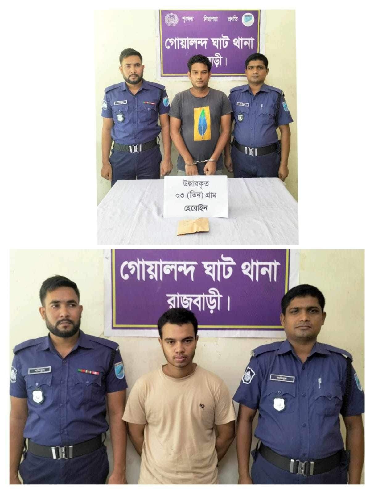 রাজবাড়ী জেলার গোয়ালন্দ ঘাট থানা পুলিশের মাদক বিরোধী অভিযানে ০৩ হেরোইনসহ ০১ জন মাদক ব্যবসায়ী ও চাঁদাবাজি মামলার ০১ জন