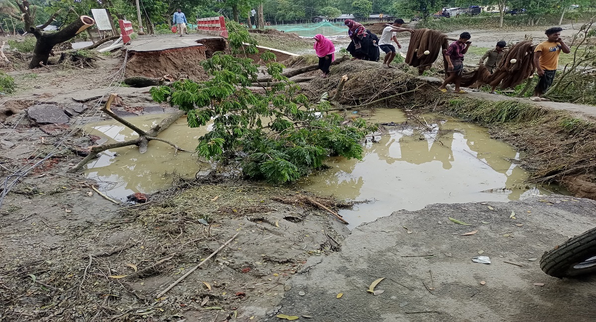 বন্যার পানির স্রোতে ভেঙে গেছে সাতকানিয়ার বাজালিয়া বুড়ির দোকানে রাস্তা ও ব্রিজ