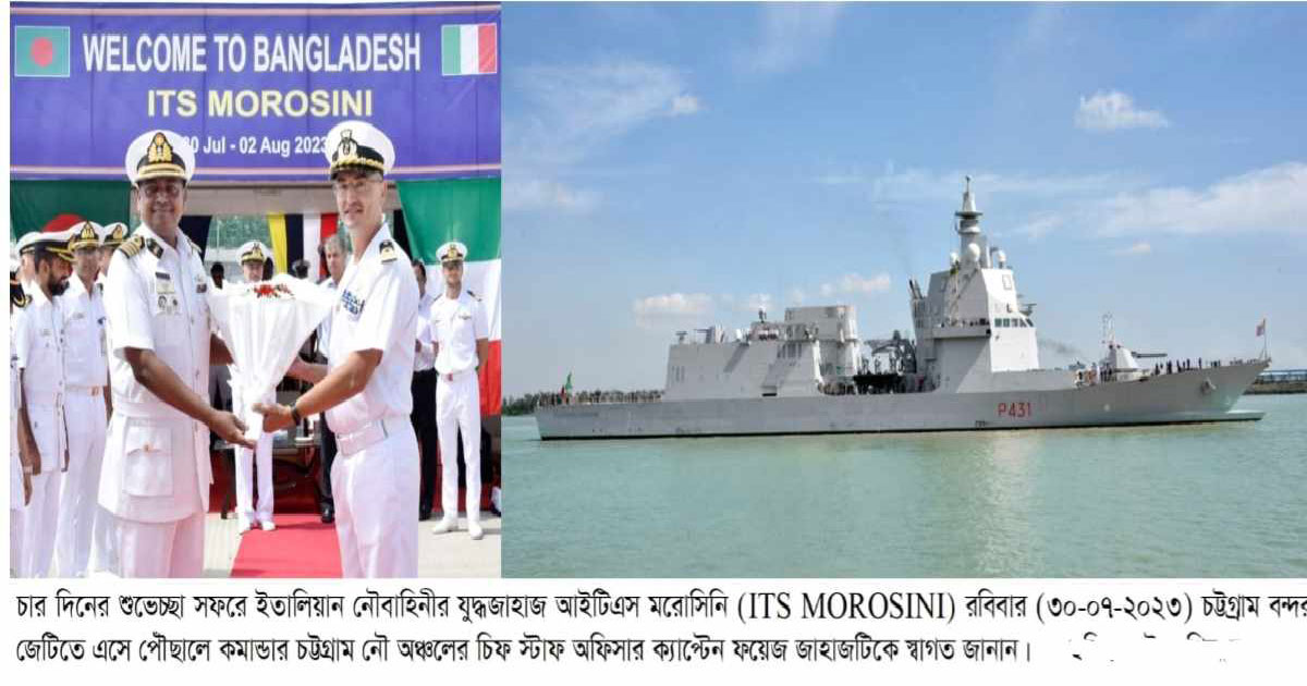 চার দিনের শুভেচ্ছা সফরে বাংলাদেশে এসে পৌঁছেছে ইতালিয়ান নৌবাহিনীর যুদ্ধজাহাজ আইটিএস মরোসিনি (ITS MOROSINI)। ৩০ জুলাই রবিবার জাহাজটি চট্টগ্রাম বন্দর