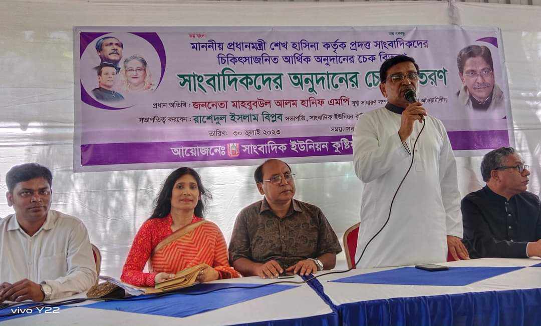 কুষ্টিয়ায় সাংবাদিকদের মাঝে প্রধানমন্ত্রী শেখ হাসিনা কর্তৃক প্রদত্ত সাংবাদিকদের চিকিৎসাজনিত আর্থিক অনুদানের চেক বিতরণ করা হয়।৩০জুলাই ২০২৩ রবিবার বেলা ১১টায়
