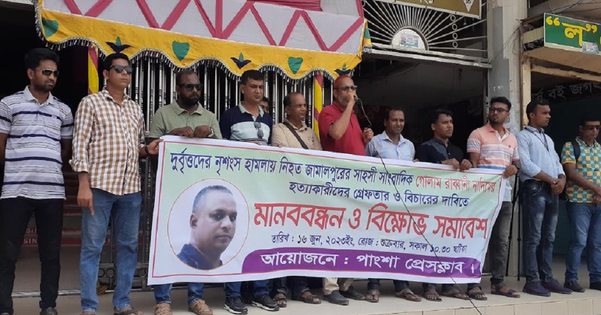 জামালপুরে সন্ত্রাসী হামলায় সাংবাদিক গোলাম রব্বানি নাদিম হত্যার প্রতিবাদে রাজবাড়ীর পাংশায় মানববন্ধন করেছে স্থানীয় সাংবাদিকেরা। শুক্রবার, ১৬ জুন সকাল সাড়ে