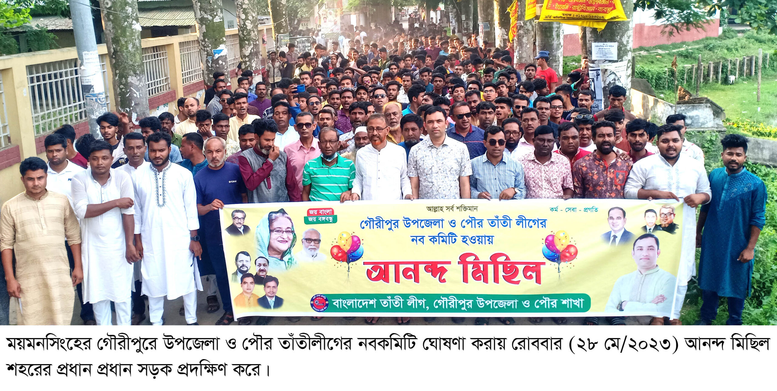 বাংলাদেশ তাঁতী লীগ ময়মনসিংহের গৌরীপুর উপজেলা ও পৌর শাখার নতুন কমিটি গঠন করায় রোববার (২৮ মে) এক বিশাল আনন্দ মিছিল