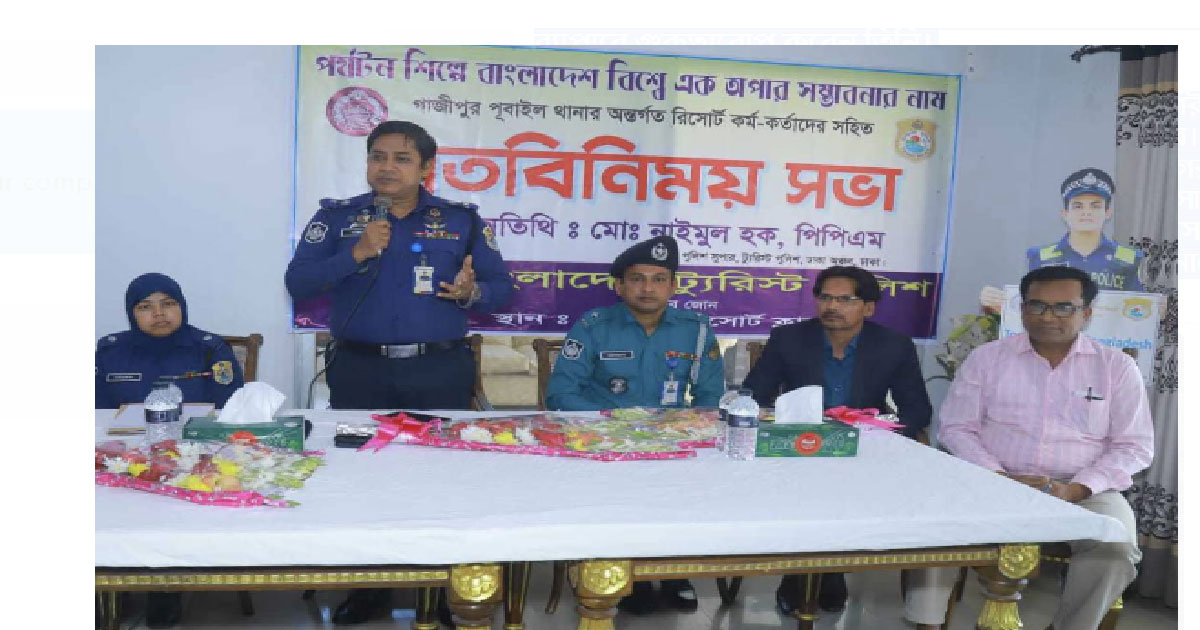 গাজীপুর পূবাইলে পর্যটনের বিকাশ ও পর্যটকদের সেবা নিশ্চিতে ট্যুরিস্ট পুলিশের উদ্যোগে মতবিনিময় সভা অনুষ্ঠিত হয়েছে। পূবাইল থানা এলাকার সকল রিসোর্ট