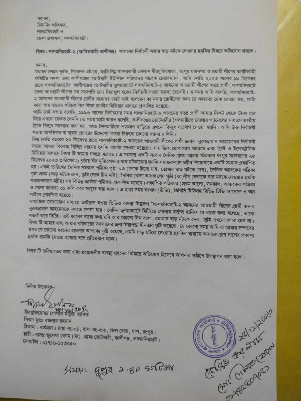 লালমনিরহাট-২ আসনে নৌকার প্রার্থী সমাজকল্যাণ মন্ত্রী নুরুজ্জামান আহমেদের বিরুদ্ধে জেলা রিটার্নিং কর্মকর্তার কাছে হুমকির লিখিত অভিযোগ করেছেন সেই বীর মুক্তিযোদ্ধা