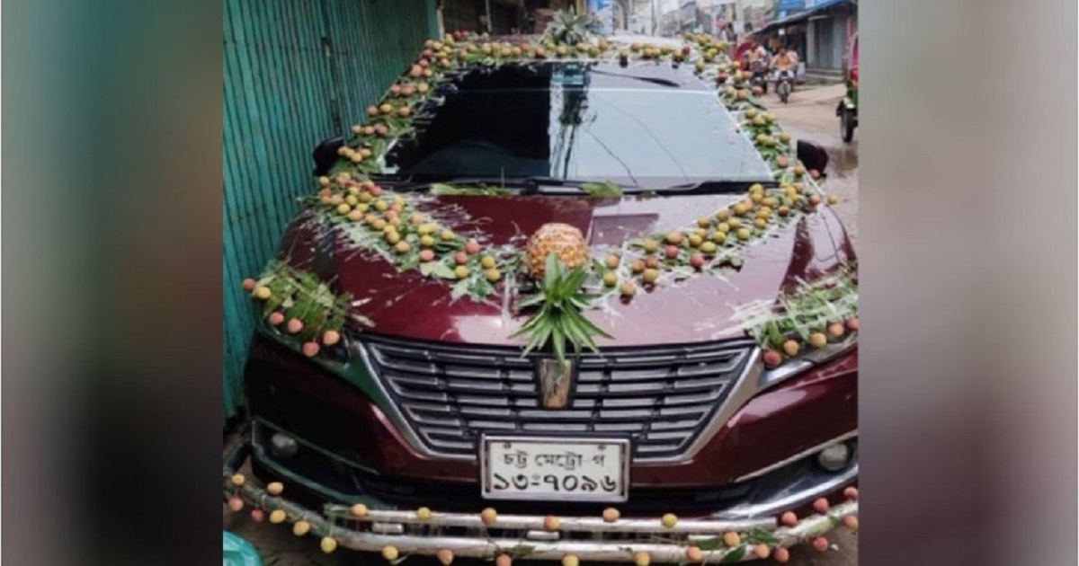 ফুল নয়, ফল দিয়েই সাজানো হলো বরের গাড়ি