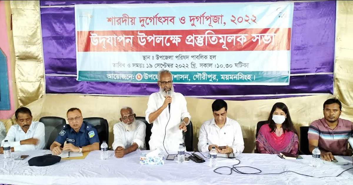ময়মনসিংহের গৌরীপুরে দুর্গাপূজা উদযাপনের প্রস্তুতিসভা সোমবার (১৯ সেপ্টেম্বর) স্থানীয় উপজেলা পাবলিক মিলনায়তনে অনুষ্ঠিত হয়। সভায় প্রধান অতিথি হিসেবে উপস্থিত ছিলেন
