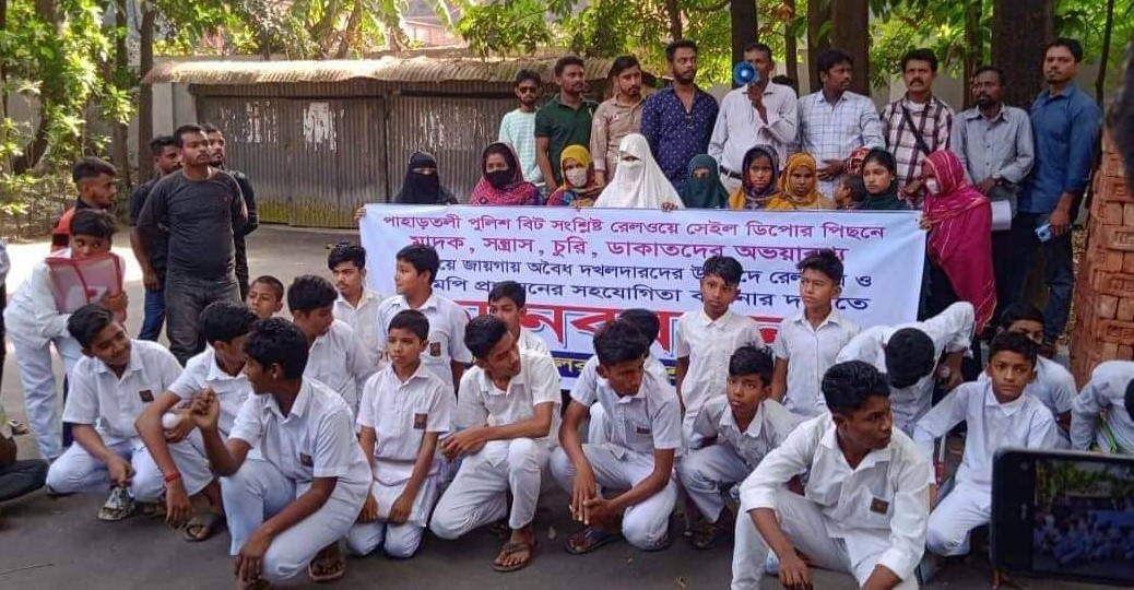 বন্দর নগরীর পাহাড়তলী এলাকায় রেলওয়ের ভূমিতে গড়ে উঠা মাদকের স্পট উচ্ছেদের দাবিতে চটগ্রাম বিভাগীয় রেলওয়ে ব্যবস্থাপকের কার্যালয় ঘেরাও করে মানববন্ধন
