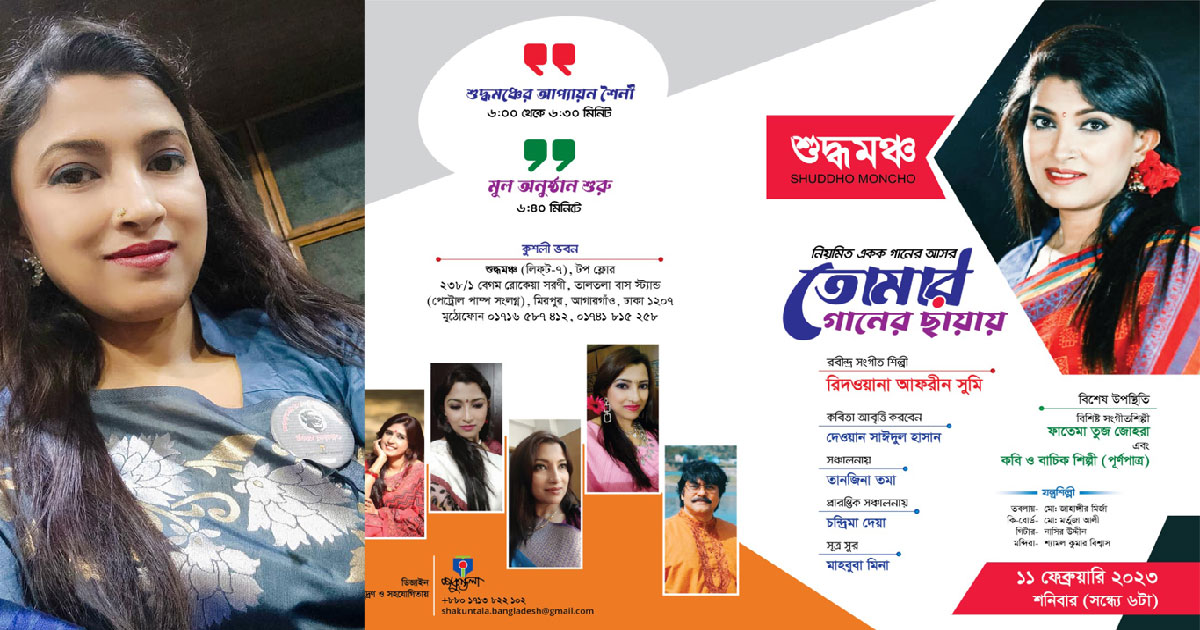 মিস্টি গায়িকা রিদওয়ানা আফরীন সুমির একক সঙ্গীত সন্ধ্যা আজ শনিবার। তালতলার কুশলি ভবনের টপ ফ্লোরে এই সঙ্গীত সন্ধ্যার আয়োজন করেছে