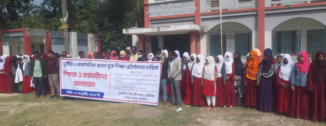 দুর্নীতি ও রাজনৈতিক প্রভাবমুক্ত শিক্ষা প্রতিষ্ঠানসহ ৫ দফা দাবিতে বিশাল মানববন্ধন কর্মসূচি পালন করেছেন পাবনার দুবলিয়া উচ্চ বিদ্যালয়ের শিক্ষক, কর্মচারি